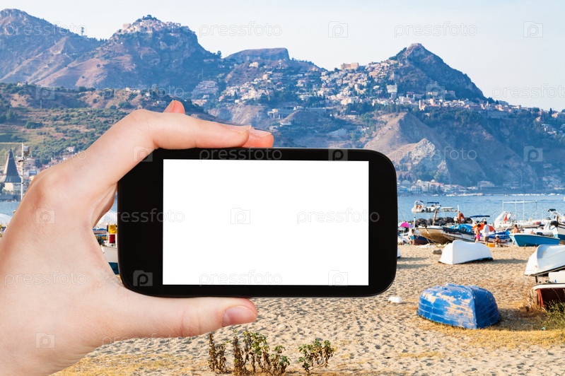 Турист фотографирует городской песчаный пляж и старый порт