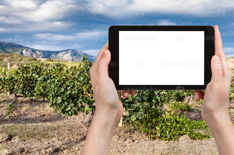 Турист фотографирует Массандровский виноградник в Крыму