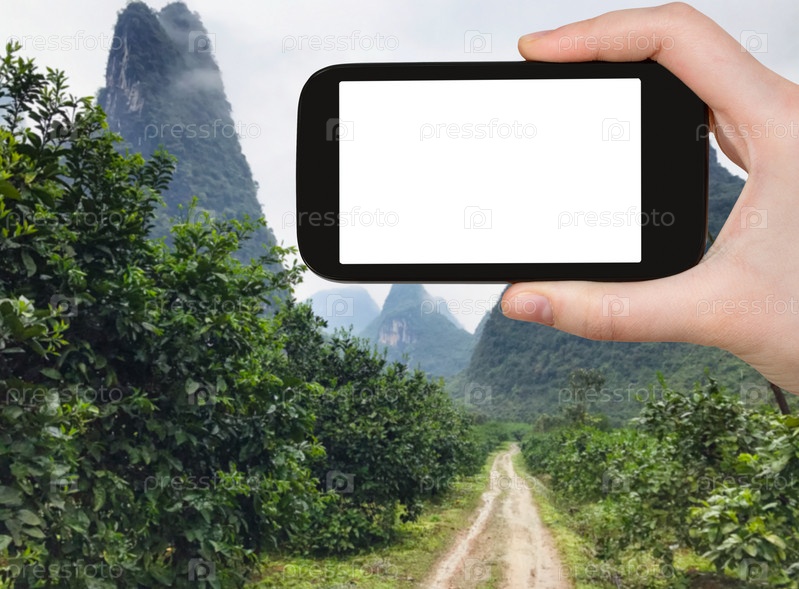 Турист фотографирует пики карстовых гор в Яншо