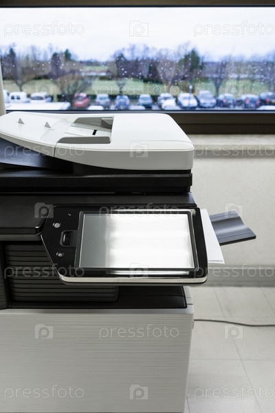 Большой копировальный аппарат с сенсорным дисплеем в офисе