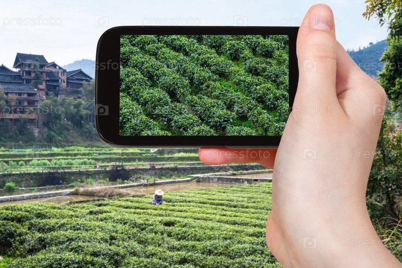 Турист фотографирует чайную плантацию