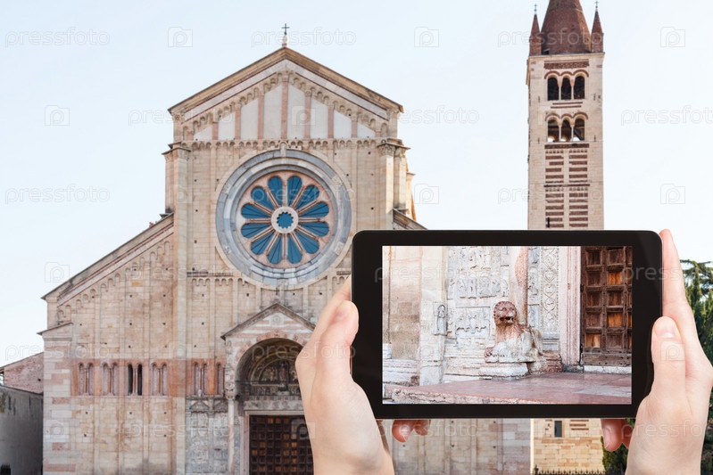 Турист фотографирует Базилику Сан-Дзено в Вероне