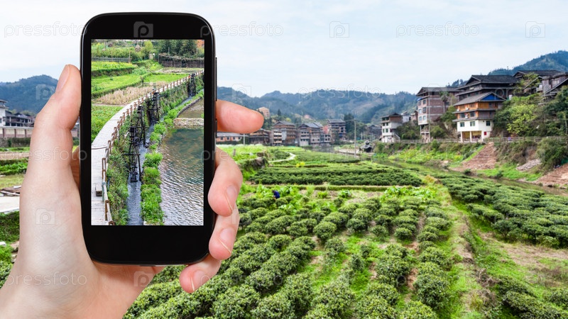 Турист фотографирует канал возле чайной плантации