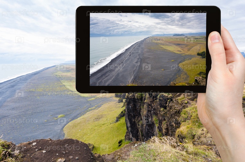 Турист фотографирует побережье в Исландии