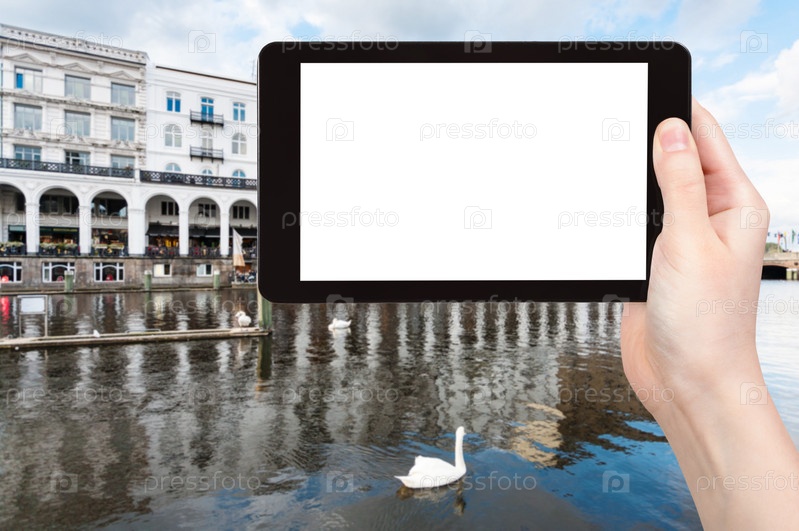 Турист фотографирует лебедей в озеро Альстер в Гамбурге