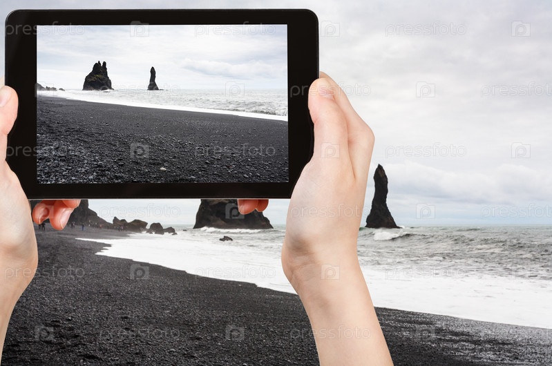 Турист фотографирует пляж Рейнсфьяра в Исландии