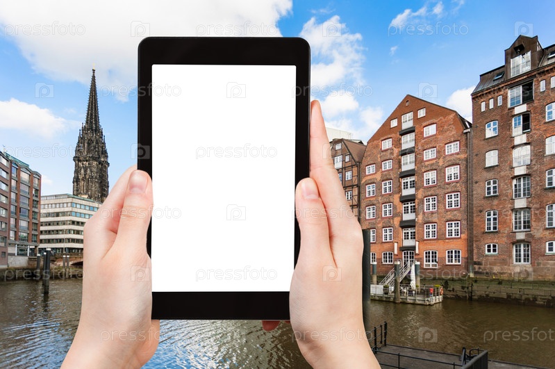 Турист фотографирует канал в городе Гамбург