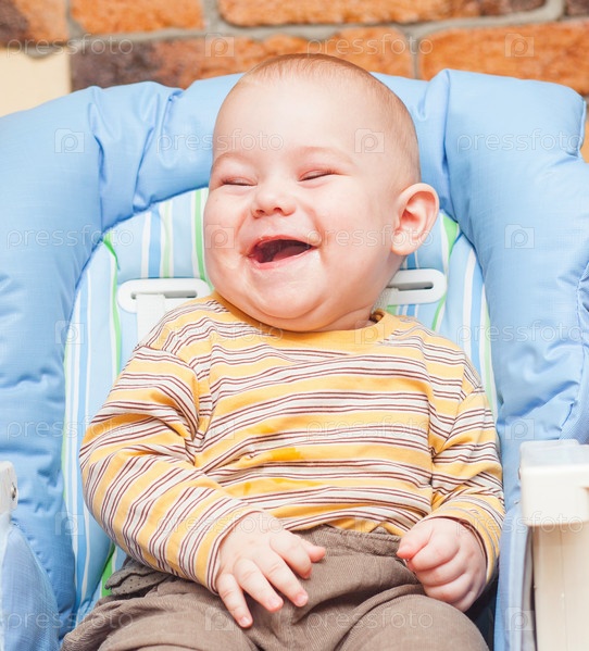 Счастливый ребенок сидит на высоком стуле