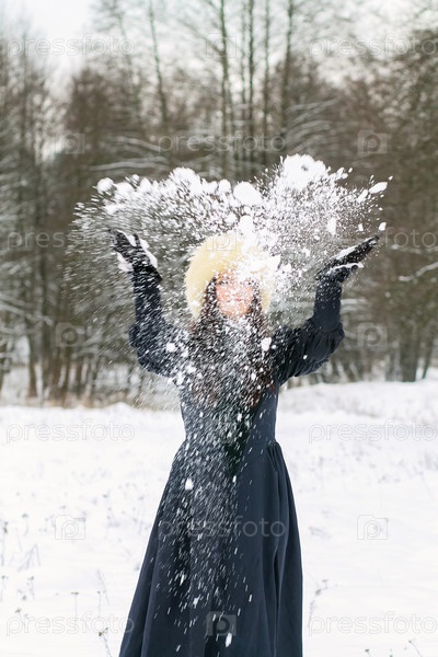 Молодая женщина играет со снегом