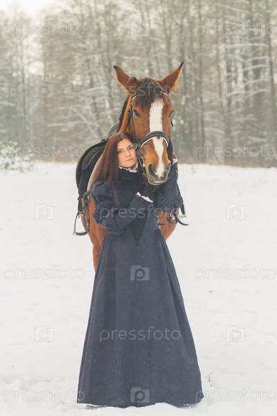 Красивая женщина и лошадь зимой