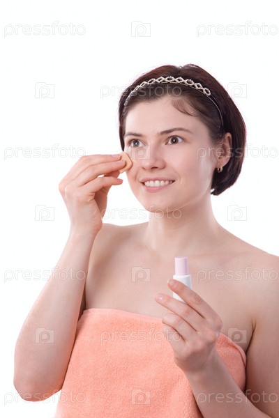 Девушка красит лицо тональным кремом
