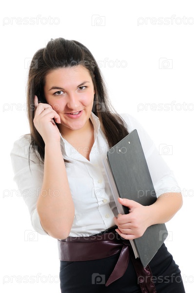 Молодая бизнес леди с телефоном на белом фоне