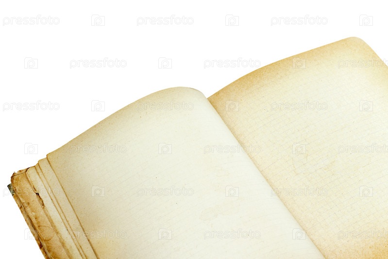 Старый открытый блокнот крупным планом, изолированный на белом фоне
