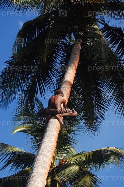 Мальчик взбирается на кокосовую пальму