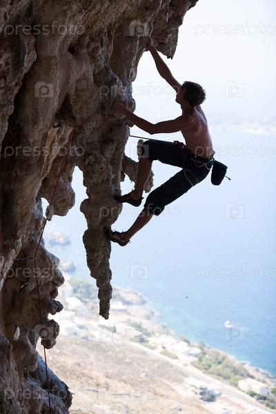Рок-альпинист на на острове Калимнос, Греция