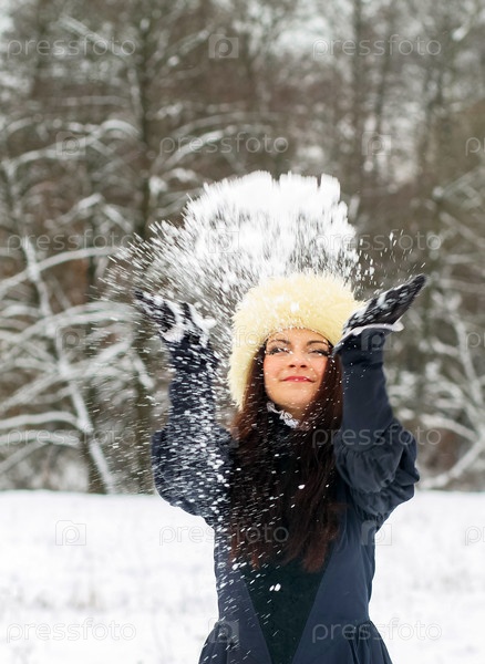 Молодая женщина играет со снегом