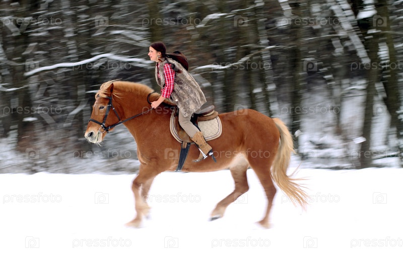 Женщина верхом на лошади на снегу