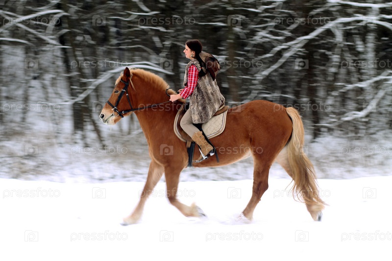 Женщина верхом на лошади на снегу