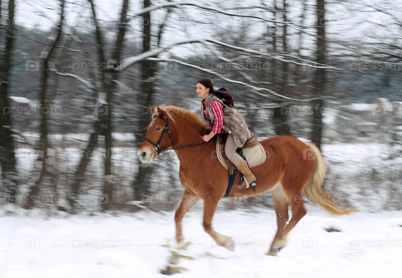 Женщина верхом на лошади на снегу
