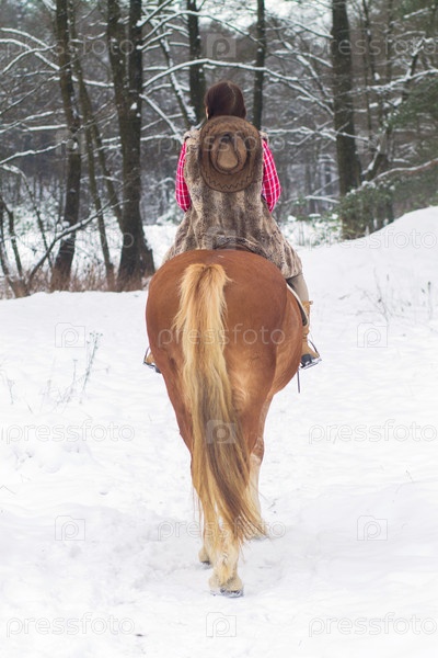 Женщина верхом на лошади на снегу