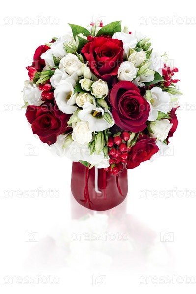 Красочный цветочный букет в красной вазе, изолированный на белом фоне