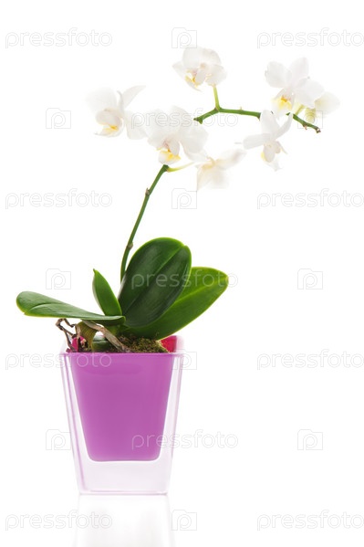 Миниатюрные белые орхидеи в вазе, изолированные на белом фоне