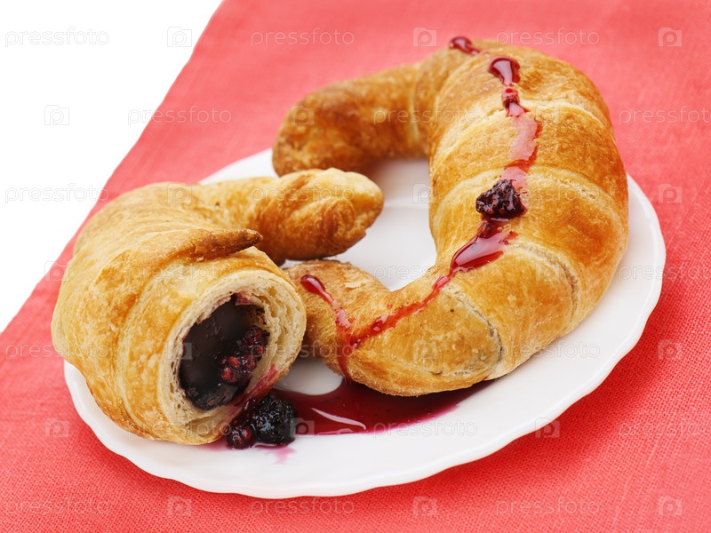 Свежие и вкусные круассаны с шоколадом и малиновым вареньем на тарелке