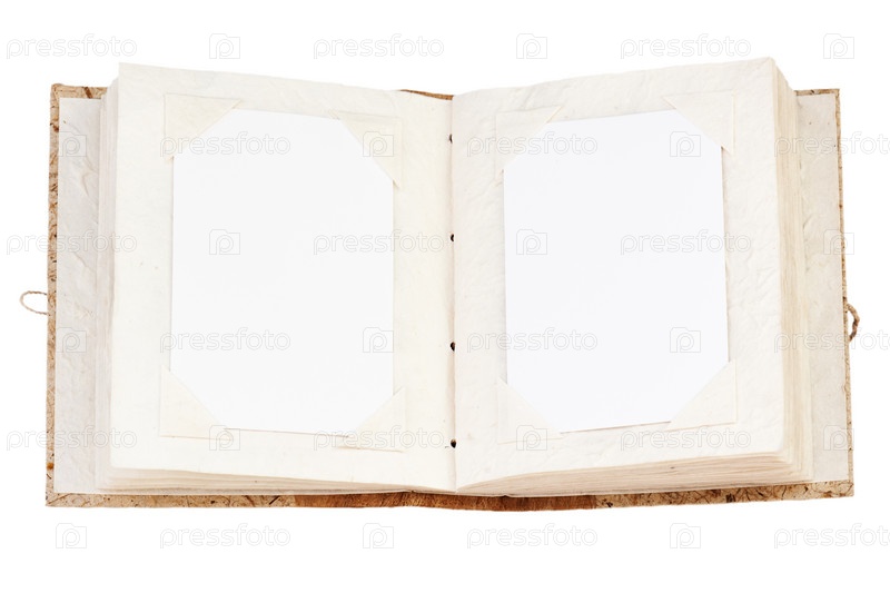 Открытый старый фотоальбом с местом для ваших фотографий, изолированный на белом фоне