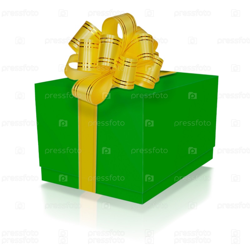 Зеленая подарочная коробка с золотой лентой и бантом, изолированная на белом фоне