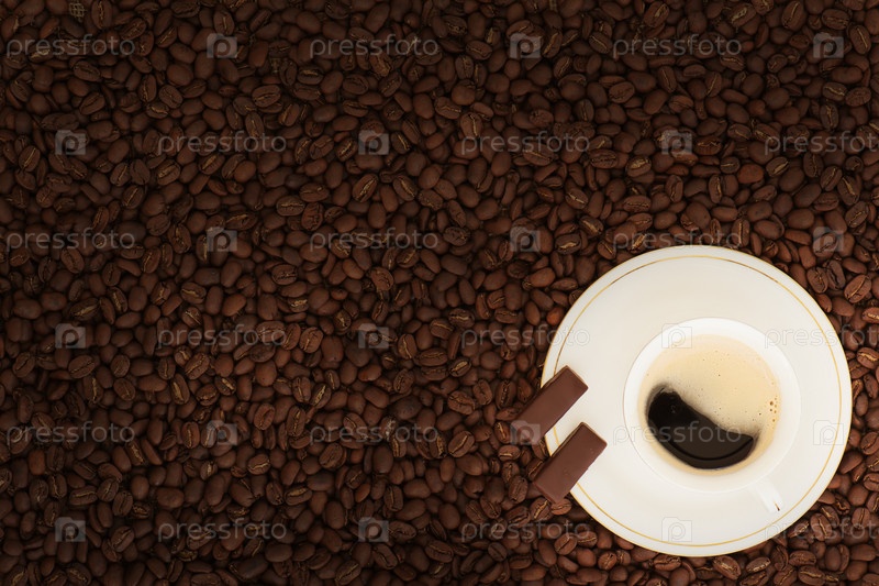 Кофе с шоколадом на фоне кофейных зерен