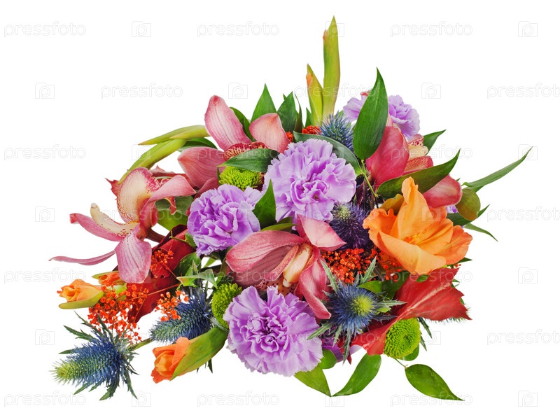 Красочный букет из роз, гвоздик и орхидей, изолированный на белом фоне