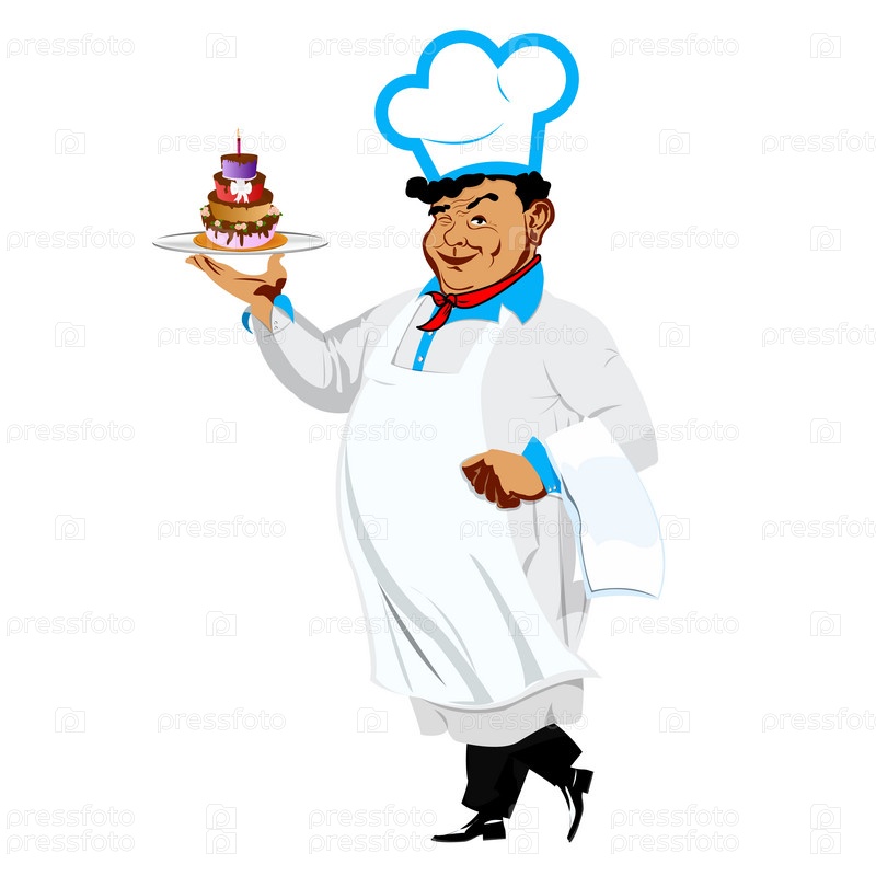 Мужчина шеф-повар с праздничным тортом на подносе на белом фоне