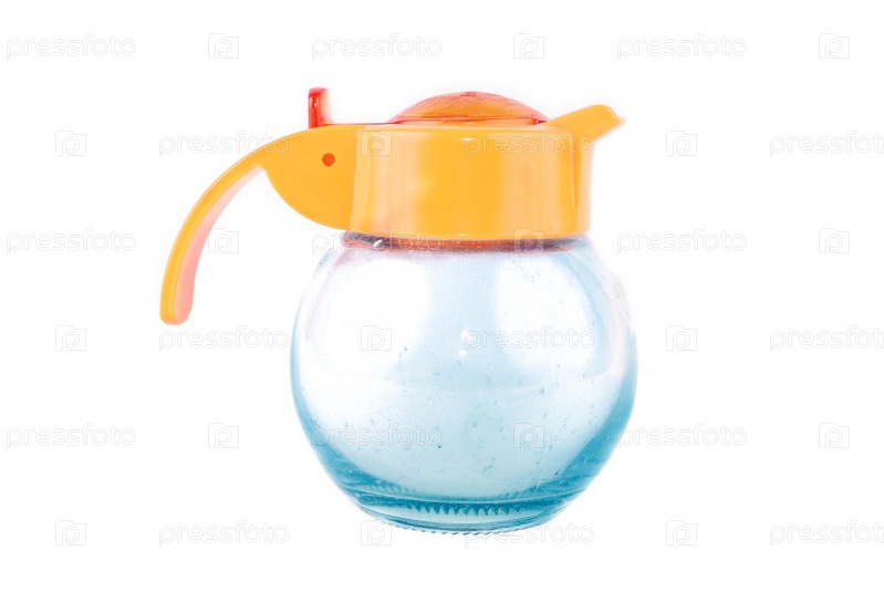 Прозрачная пластиковая сахарница на белом фоне