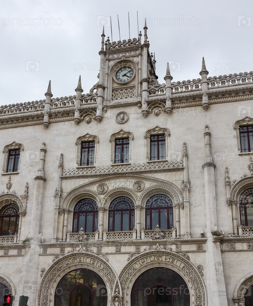 Португалия, Лиссабон, фасад железнодорожной станции Россио в стиле нео-мануэлино. Постройка португальского архитектора Жозе Луиша Монтейру между 1886 и 1887 годами