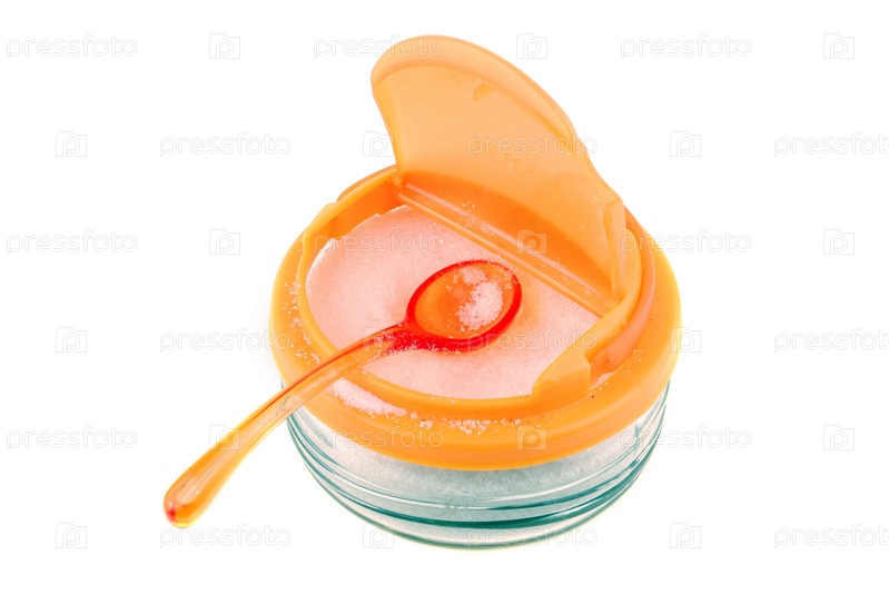 Прозрачная пластиковая сахарница с оранжевой крышкой на белом фоне