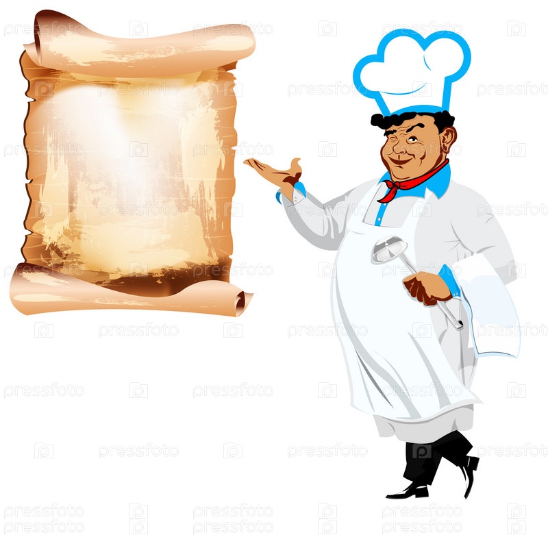 Мужчина шеф-повар и меню ресторана на белом фоне