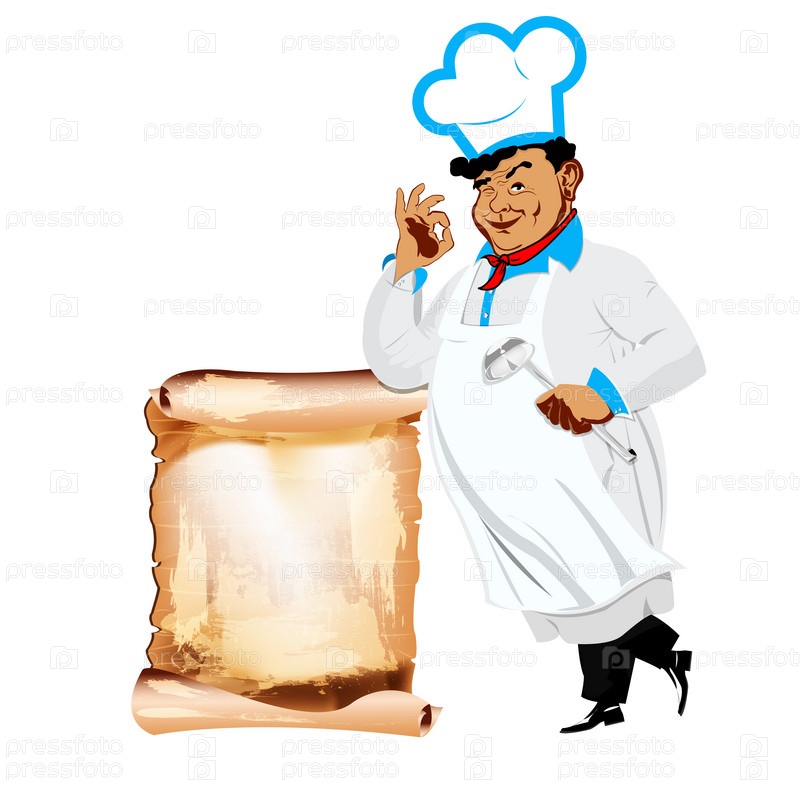Мужчина шеф-повар и меню ресторана на белом фоне