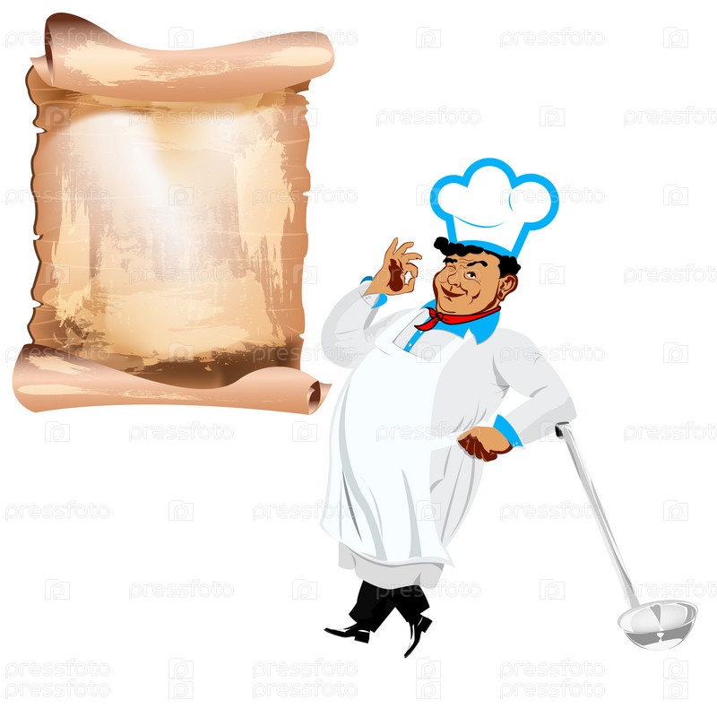 Мужчина шеф-повар и меню ресторана на белом фоне