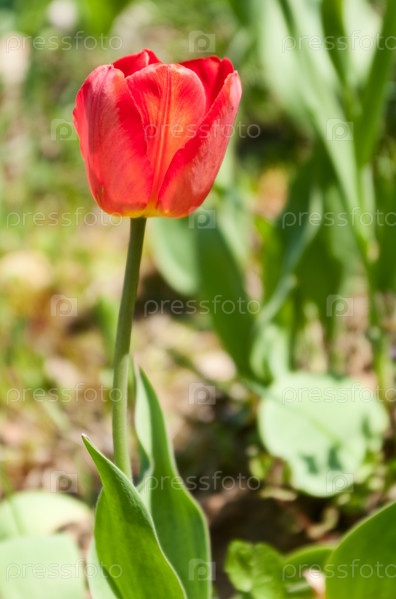 Полураскрывшийся красный тюльпан на стебле на фоне садовой зелени
