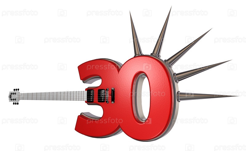 Гитара с декой в виде числа тридцать с шипами на белом фоне - 3d иллюстрация
