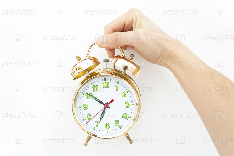 Будильник в руке на белом фоне