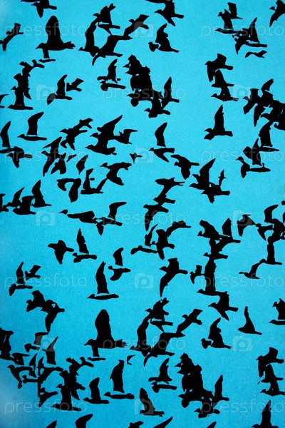 Набор черных силуэтов птиц на синем фоне