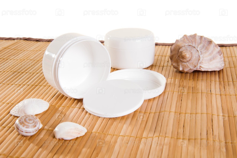 Пустые баночки для кремов на бамбуковом коврике