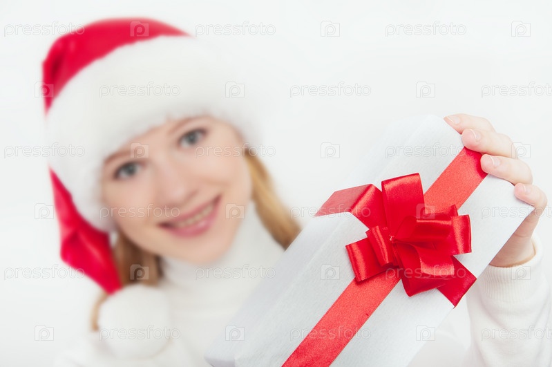 Женщина и белый рождественский подарок с красной лентой