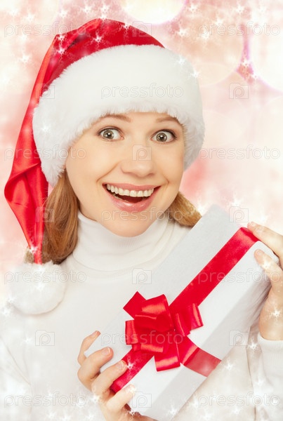 Веселая девушка в шапке с рождественским подарком
