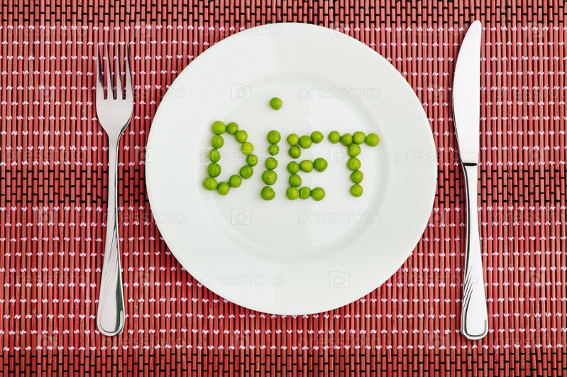 Концепция: здоровое питание и диета. Слово «диета» из горошка на тарелке