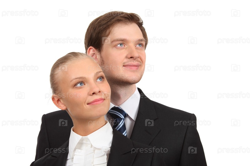Молодая пара в костюмах на белом фоне