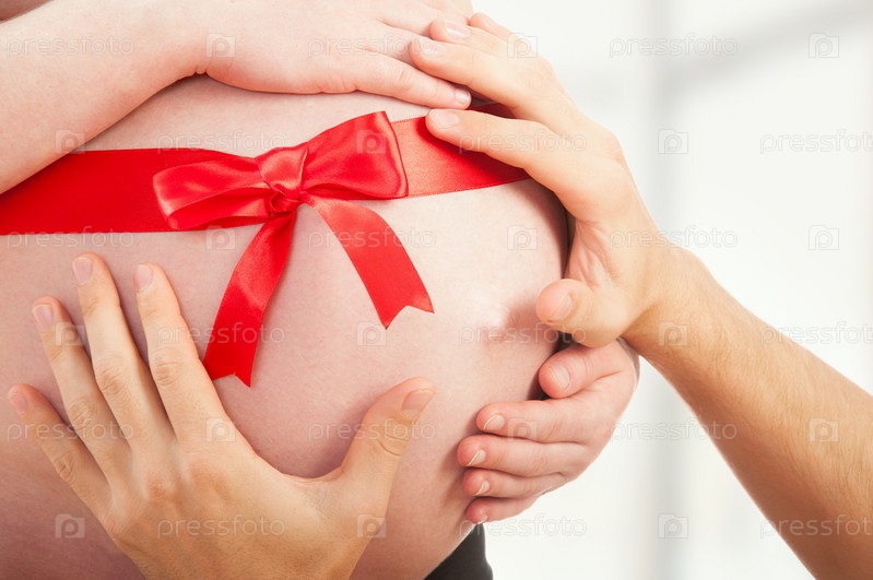 Беременный живот с красной лентой и руки мамы и папы