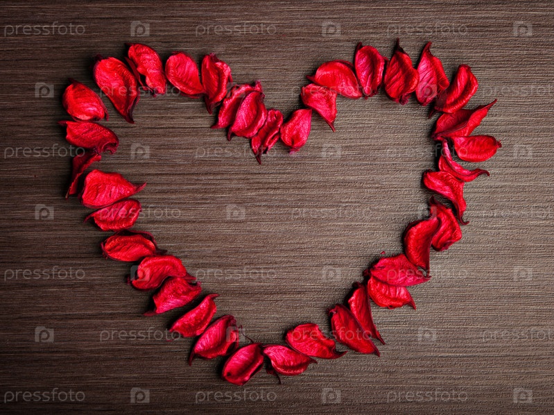 День Святого Валентина. Лепестки роз в форме сердца на деревянном фоне