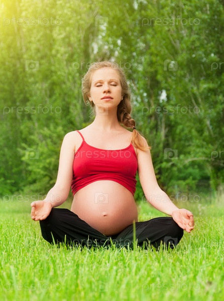 Беременная женщина медитирует на природе